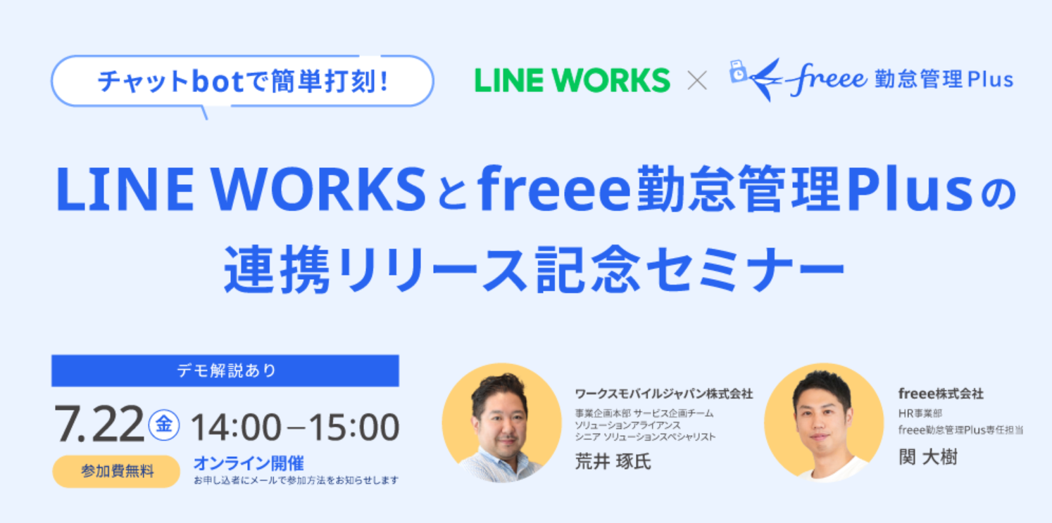 ・連携を記念し、7月22日(金)14時から「LINE WORKSで簡単打刻!freee勤怠管理Plusの連携リリース記念セミナー」を実施いたします。ぜひ、お立ち寄りください