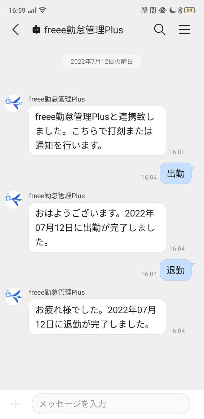 下記の写真のように登録した文言をチャット(トーク)で入力すると出勤や退勤が打刻されます。