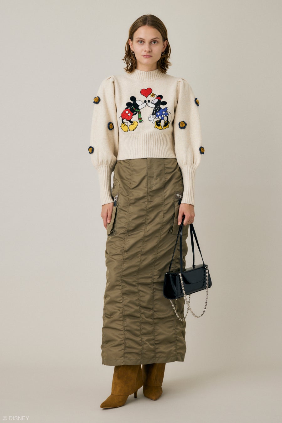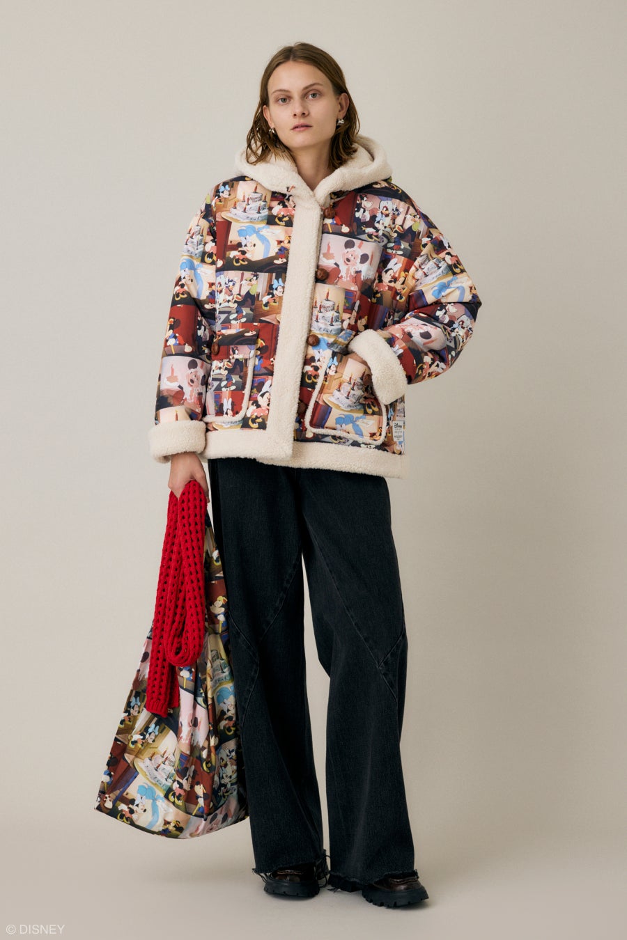 スタンダードキャラクターでは短編アニメーション映画『Mickey's Birthday Party』(1942)のミニーがサプライズでミッキーの誕生日を祝う名シーンを総柄にしたアノラックコートやマルシェバッグをはじめ、90sテイスト溢れるベロアのセットアップにはラインストーンや刺繍でミッキーを表現。モール糸で編み立てたヴィンテージ感のあるジャカードニットやボーダーカラーのニットカーデ、お花のモチーフ付きボリュームスリーブニットなどレトロでノスタルジックで個性的アイテムをバリエーション豊かに取り揃え、細部にまでアイデアの詰まったデザインが盛りだくさん。