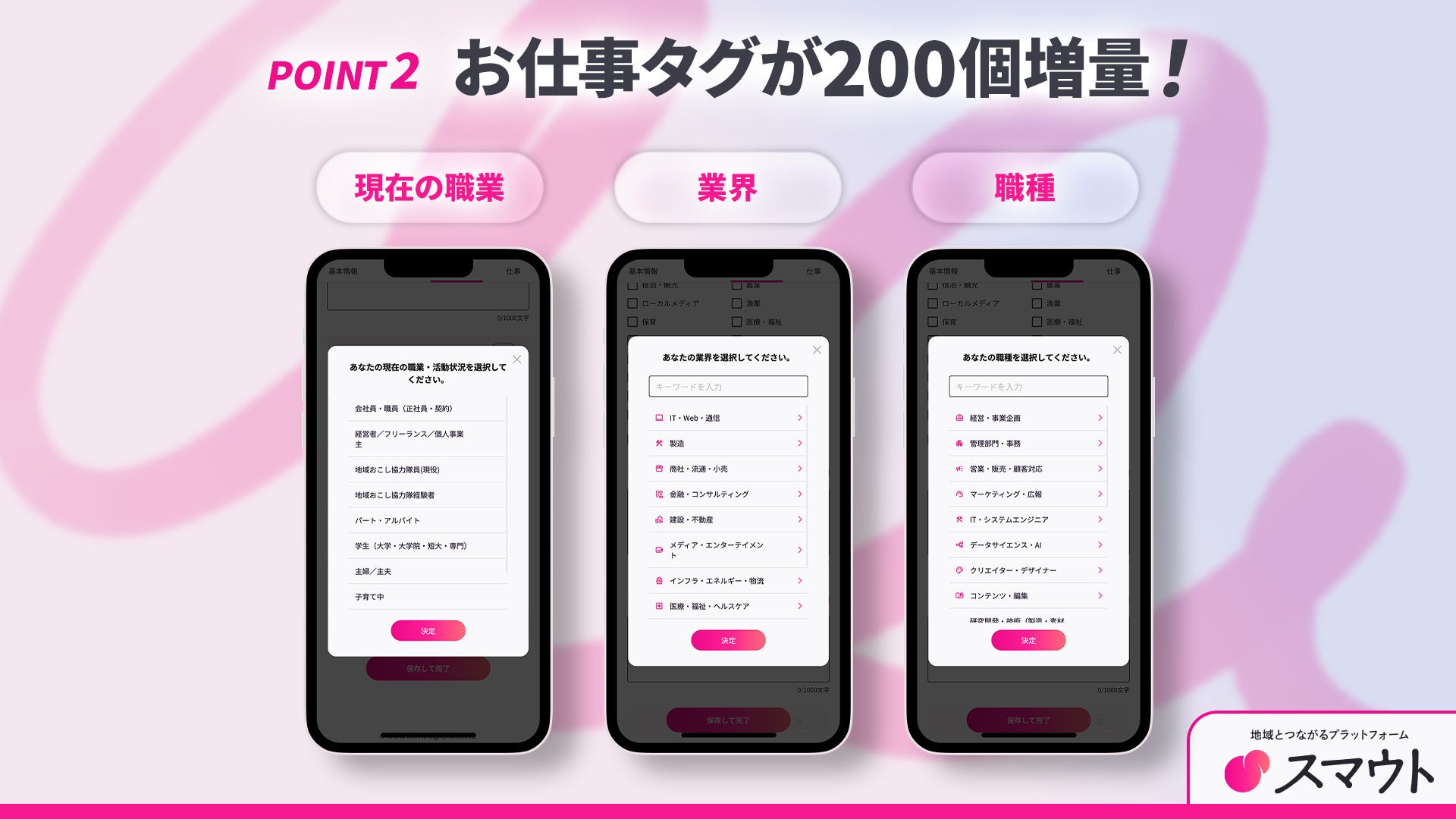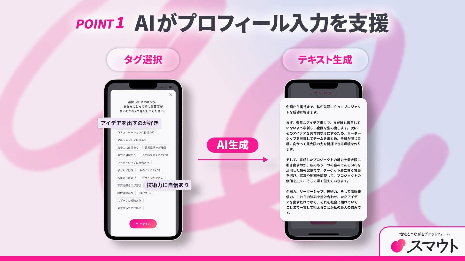 今回の改修では、AIによるプロフィール作成支援の導入をはじめ、職業タグを200種類以上に拡充。さらに、地域にまつわる興味・関心を可視化する「タイプ診断」機能を新たに搭載しました。