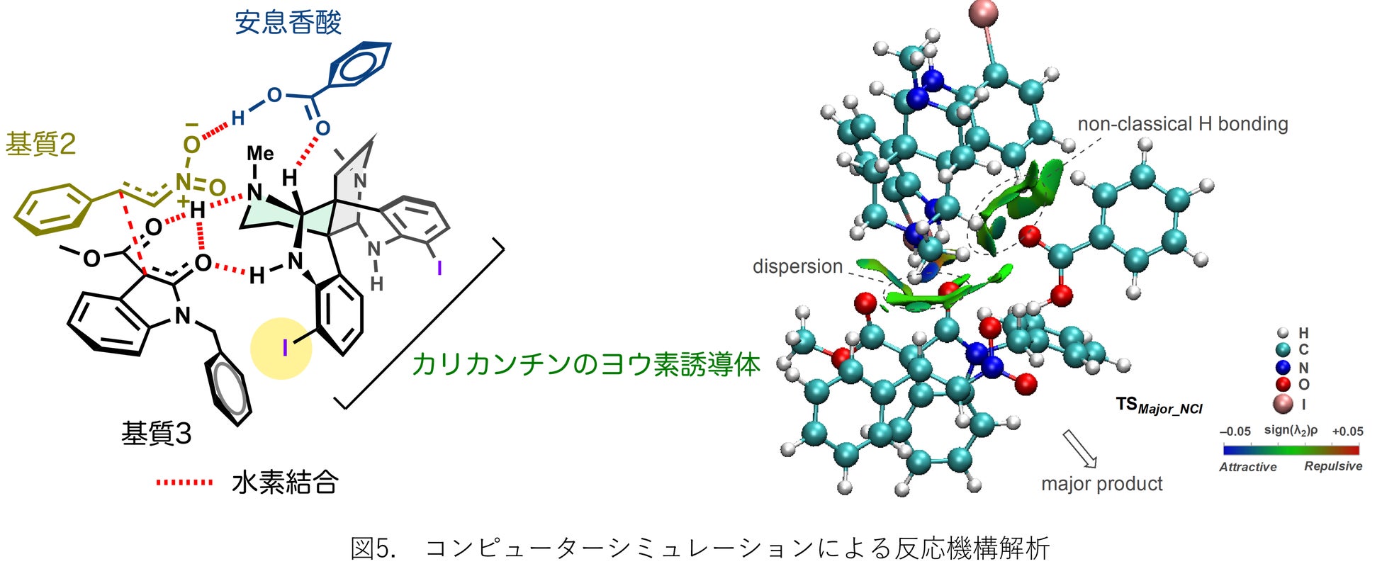 研究成果1で発見した天然物の中から、カリカンチンを選択し、さらに触媒活性を高める検討を行いました。その結果、図4に示すように、カリカンチンのベンゼン環部にヨウ素を導入した人工合成触媒において、非常に高いエナンチオ選択性(注4)で反応が進行することを見出しました(96:4)。収率も90%と非常に高く、実用的な手法に昇華することができました。これまでにカリカンチンに類似する不斉有機触媒は開発されておらず、当研究室の天然物ライブラリーから新しい構造様式をもつ不斉有機触媒を見つけ出すことに成功しました。