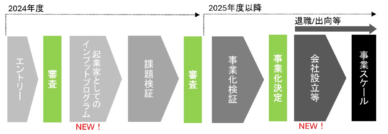 2024年7月よりエントリーを開始し、各審査を経て、事業化検証を行います。その後、社外の投資家を含めた事業化審査を通過した案件が会社設立等の上、正式に事業化となります。