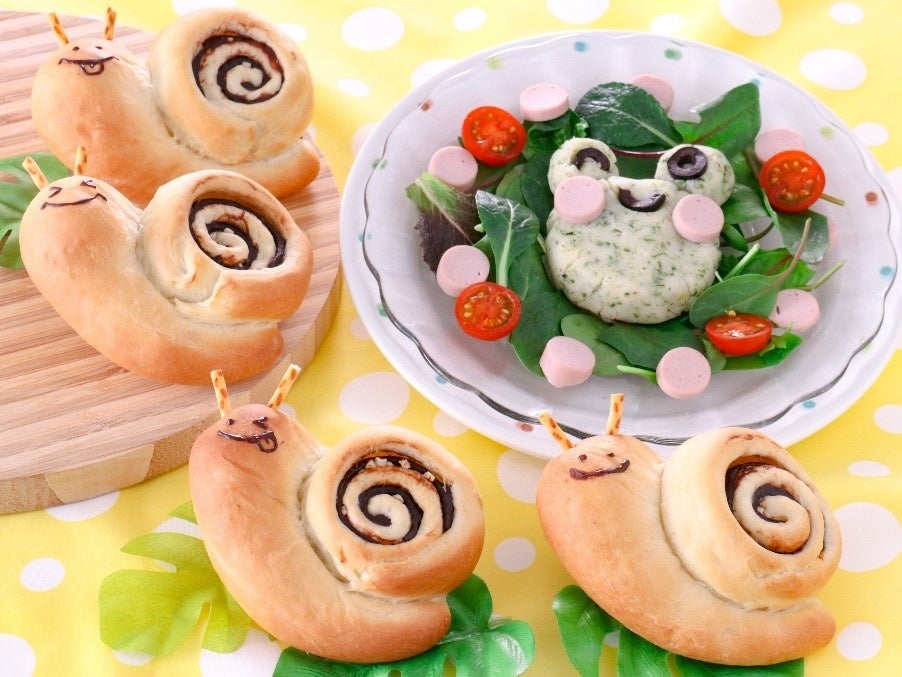 ふわふわなパン生地に触れて「作る」楽しさを学ぼう ! 仕上げに顔を描けば自分だけのオリジナルカタツムリパンとカエルくんのポテトサラダのできあがり♪ しとしと雨の日も、手作り料理で楽しくHappyに過ごしましょう。