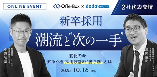株式会社ベネッセホールディングスとパーソルキャリア株式会社の合弁会社:株式会社ベネッセ i-キャリア(本社:東京都新宿区、代表取締役社長:風間 直樹)が運営する、doda発の新卒オファーサービス「dodaキャンパス」は、「OfferBox」を運営する株式会社i-plug(本社:大阪市淀川区、代表取締役CEO 中野 智哉)と、企業の人事・採用担当者を対象にしたオンラインセミナー「新卒採用 潮流と“次の一手”変化の今、知るべき採用設計の“勝ち筋”とは」を2025年10月16日(木)に共同開催します。