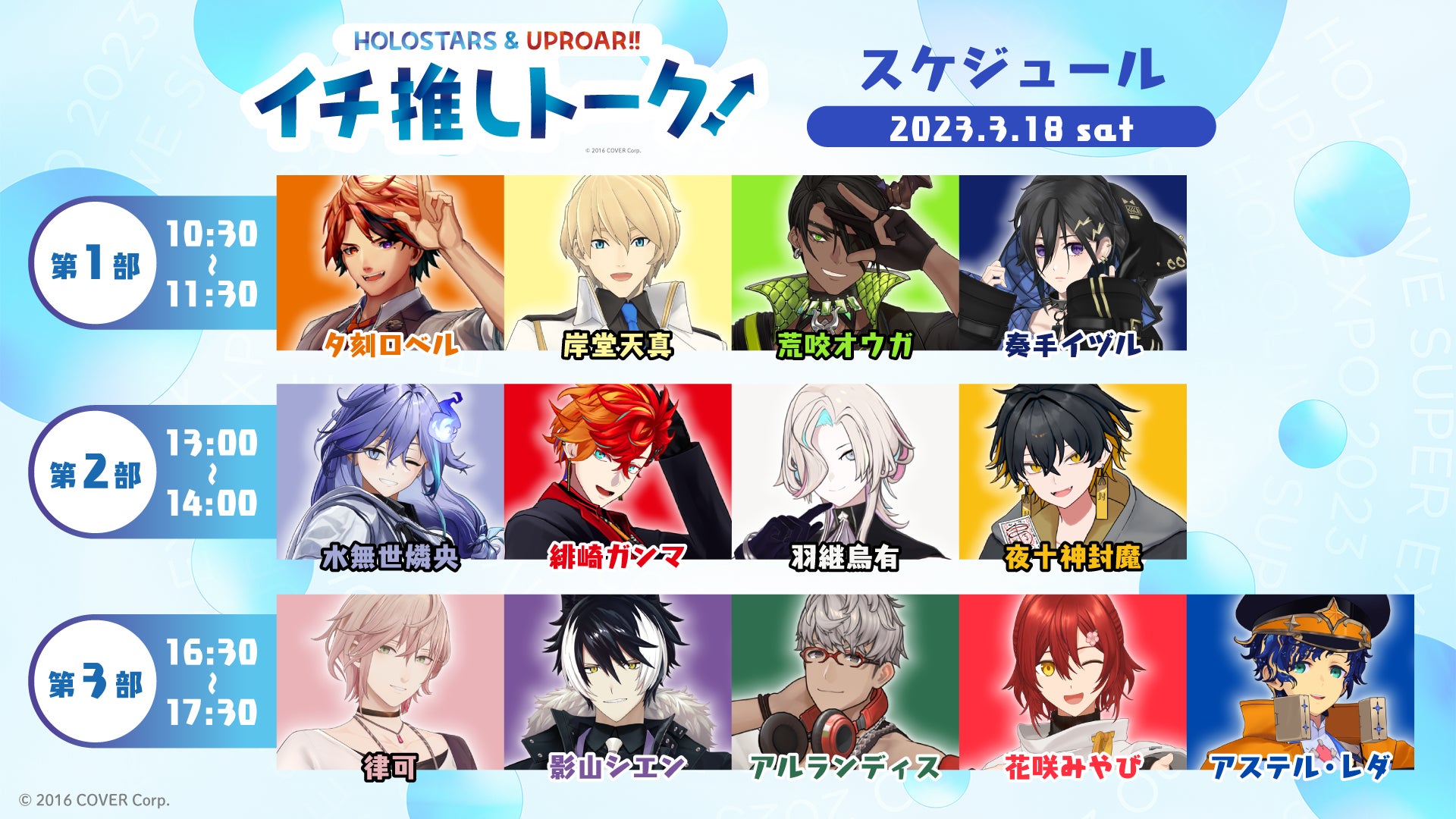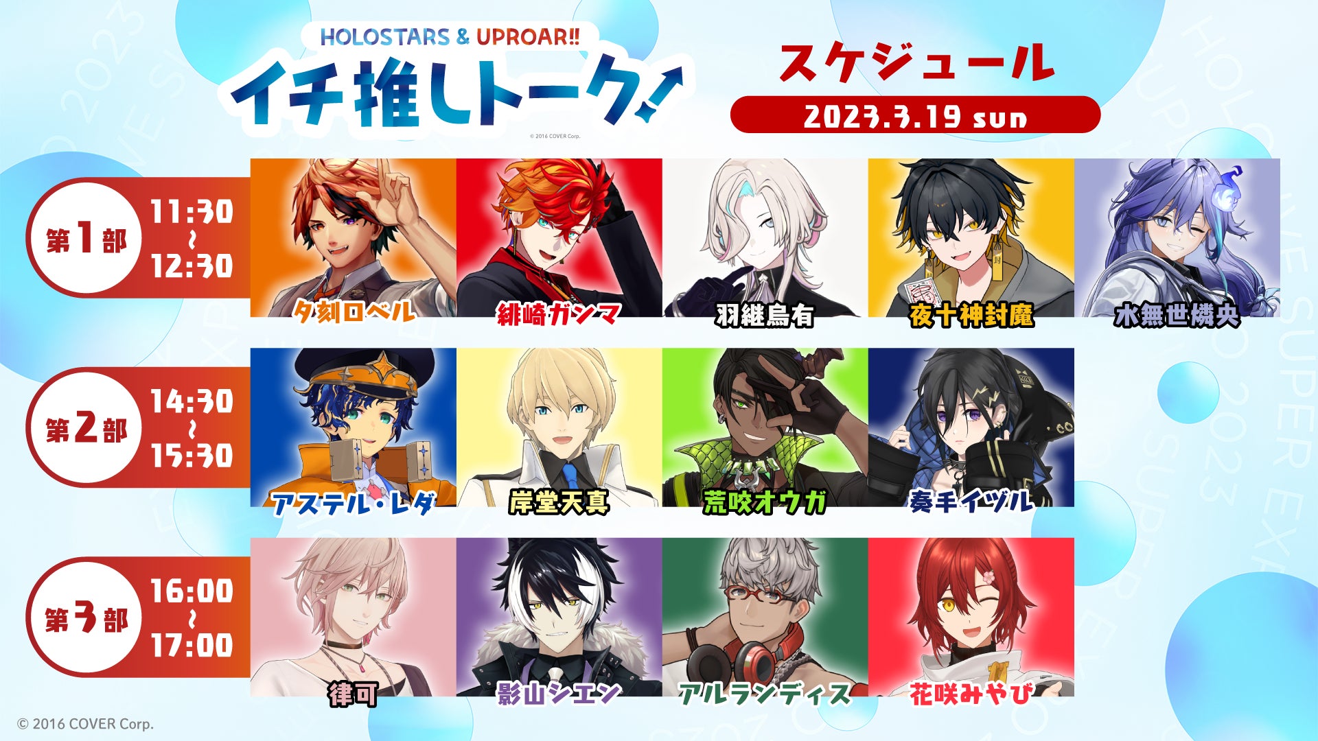 星街すいせい / アキ・ローゼンタール / 白上フブキ / 夏色まつり / 湊あくあ / 紫咲シオン / 百鬼あやめ / 大神ミオ / 猫又おかゆ / 戌神ころね / 兎田ぺこら / 宝鐘マリン / 天音かなた / 常闇トワ / 雪花ラミィ / 桃鈴ねね / 獅白ぼたん / ムーナ・ホシノヴァ / アーニャ・メルフィッサ / パヴォリア・レイネ / 森カリオペ / がうる・ぐら / IRyS / セレス・ファウナ / オーロ・クロニー / ハコス・ベールズ