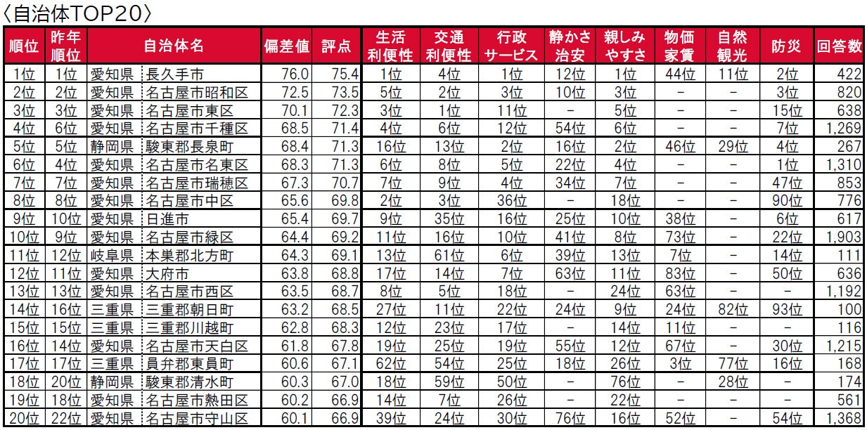 20位には、昨年22位だった愛知県名古屋市守山区が新たにランクインしていますが、それ以外の自治体は昨年と同じ顔ぶれという結果になっています。