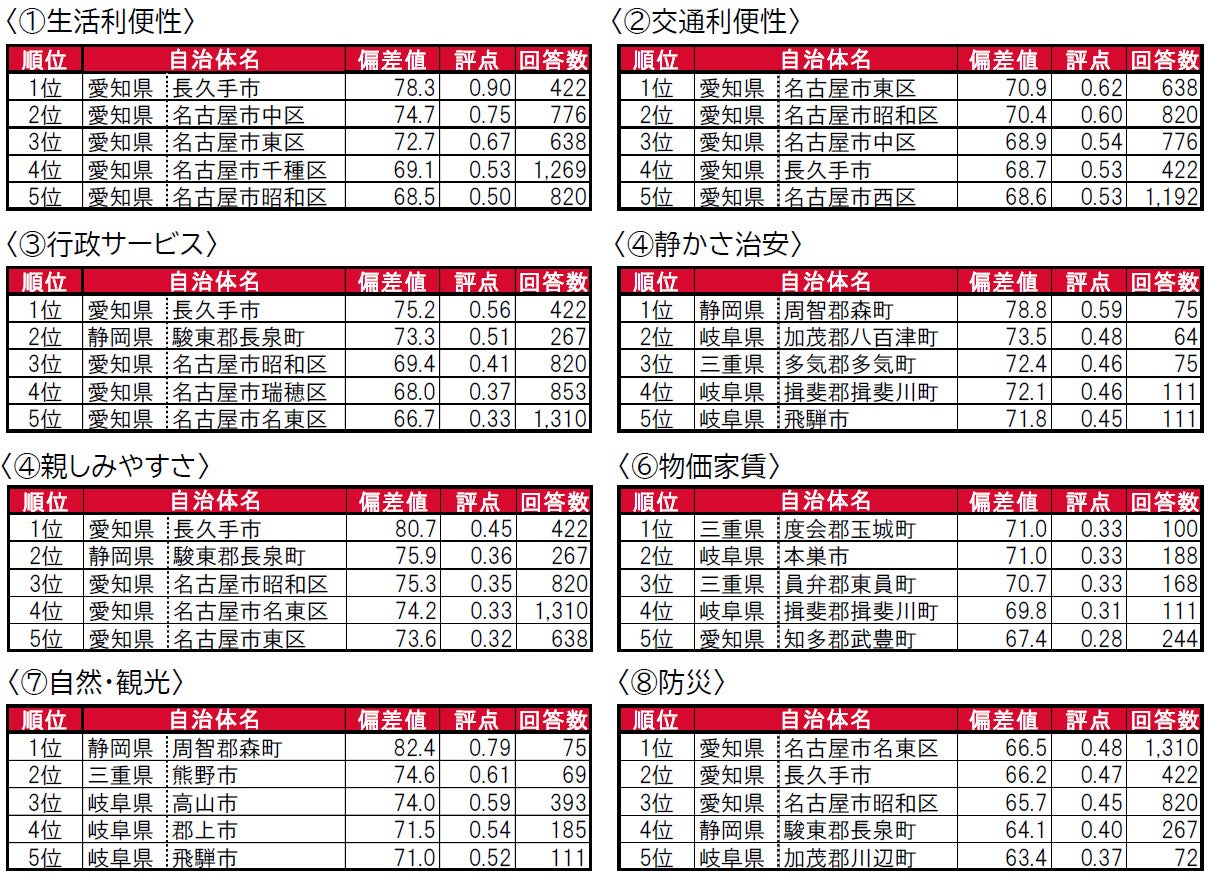 住みここちは4年連続で、1位愛知県長久手市、2位名古屋市昭和区、3位名古屋市東区。