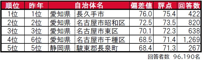 愛知県長久手市が、昨年に引き続き偏差値76.0という高い評価で1位に輝きました。また、2位と3位も昨年と変わらず、名古屋市昭和区と名古屋市東区が4年連続でランクインしています。トップ3はいずれも偏差値70台の高い評価を得ています。