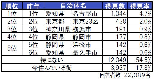 住みたい街は2年連続で、1位愛知県名古屋市、2位東京23区、3位神奈川県横浜市。