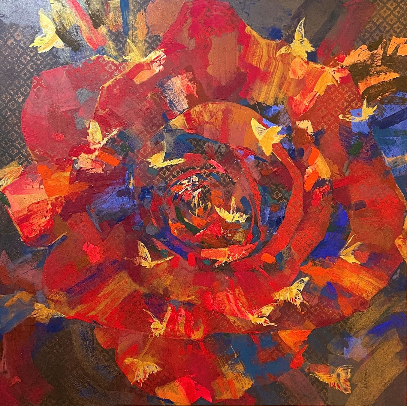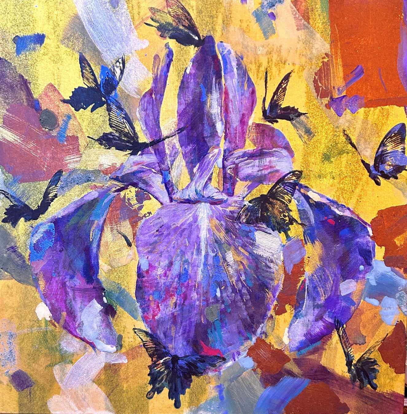 本展では、幼少期をインド、アメリカで過ごした経験を持つ作家が、日本画に表れる日本の死生観の美意識と、ファインアートにおける西洋の芸術観の美意識との、思想的・概念的融合を図る「Reincarnation 輪廻転生」シリーズの新作を発表します。これらの作品は、生命の死後、新たな形で生まれ変わることを繰り返し続ける、という仏教的な輪廻転生の考え方に基づいて制作されています。さらに、主に花や蝶をモチーフとしながら、金箔や岩絵具などを用いた日本の伝統的画法と、西洋の油画的画法を融合させることで、その画面には独特の透明感やきらめきが生まれます。RITSUKOは、これらのコンセプトと技法的な融合を繰り返しながら、「美」のReincarnation(輪廻転生、価値観の転生)を目指します。