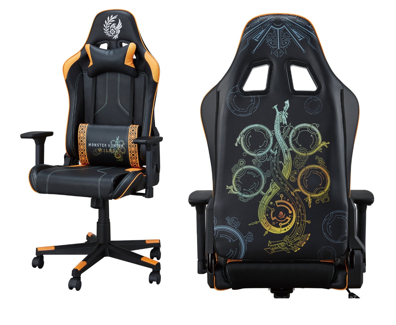 オレンジのアクセントカラーや『モンスターハンターワイルズ』のロゴ、ハンターが所属する調査隊の紋様などで、ゲームの世界観を表現したゲーミングチェア。