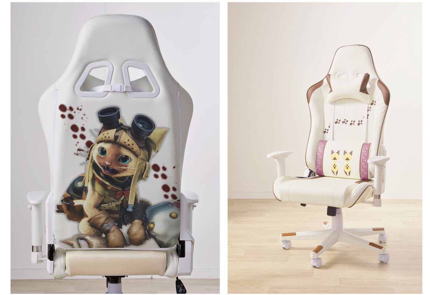 「モンスターハンター」で人気のアイルーを背面にプリントしたチェア。キャスターまでホワイトに統一した色にアイルーカラーが映える、女性にもおすすめの商品。