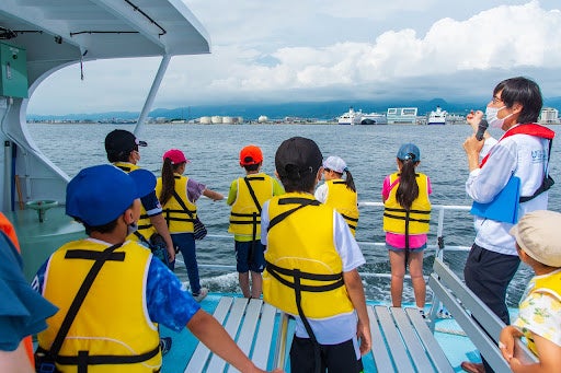 小学生が監督測量船「おおみずなぎ」に乗船し、出港する様子