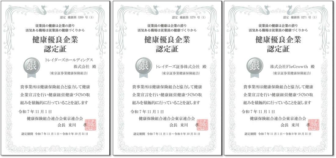 トレイダーズホールディングス株式会社(本社:東京都渋谷区、代表取締役会長兼社長:金丸 貴行)、トレイダーズ証券株式会社(本社:東京都渋谷区、代表取締役社長:須山 剛)、株式会社FleGrowth(本社:東京都渋谷区、代表取締役社長:森島 玲浩)の当社グループ3社は、健康保険組合連合会東京連合会より健康経営・健康づくりの取り組みを積極的に行っている企業として認められ、2025年11月1日付で健康優良企業「銀の認定」の更新が承認されました。