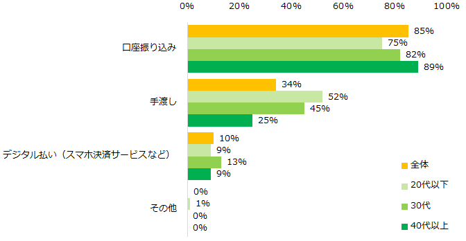 3:希望する給与の支払方法は「口座振り込み」が最多。若い年代ほど「手渡し」を希望する傾向に。 「デジタル払い」を希望する人は10%。(図6~8)