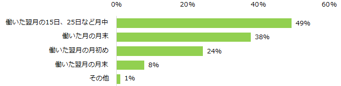「給与の支払いタイミングはいつを希望していますか?」と伺うと、56%が「月に1回」を希望していることが分かりました。月1回の支払いを希望する方にいつ支払われるのが望ましいかを聞くと、約半数が「働いた翌月の15日、25日など月中」と回答しました。具体的な理由も紹介します。