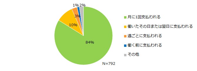 1:現在の給与の支払いタイミング、最多は「月に1回支払われる」。半数以上が現在の給与が支払われるタイミングに満足していると回答。(図1~2)