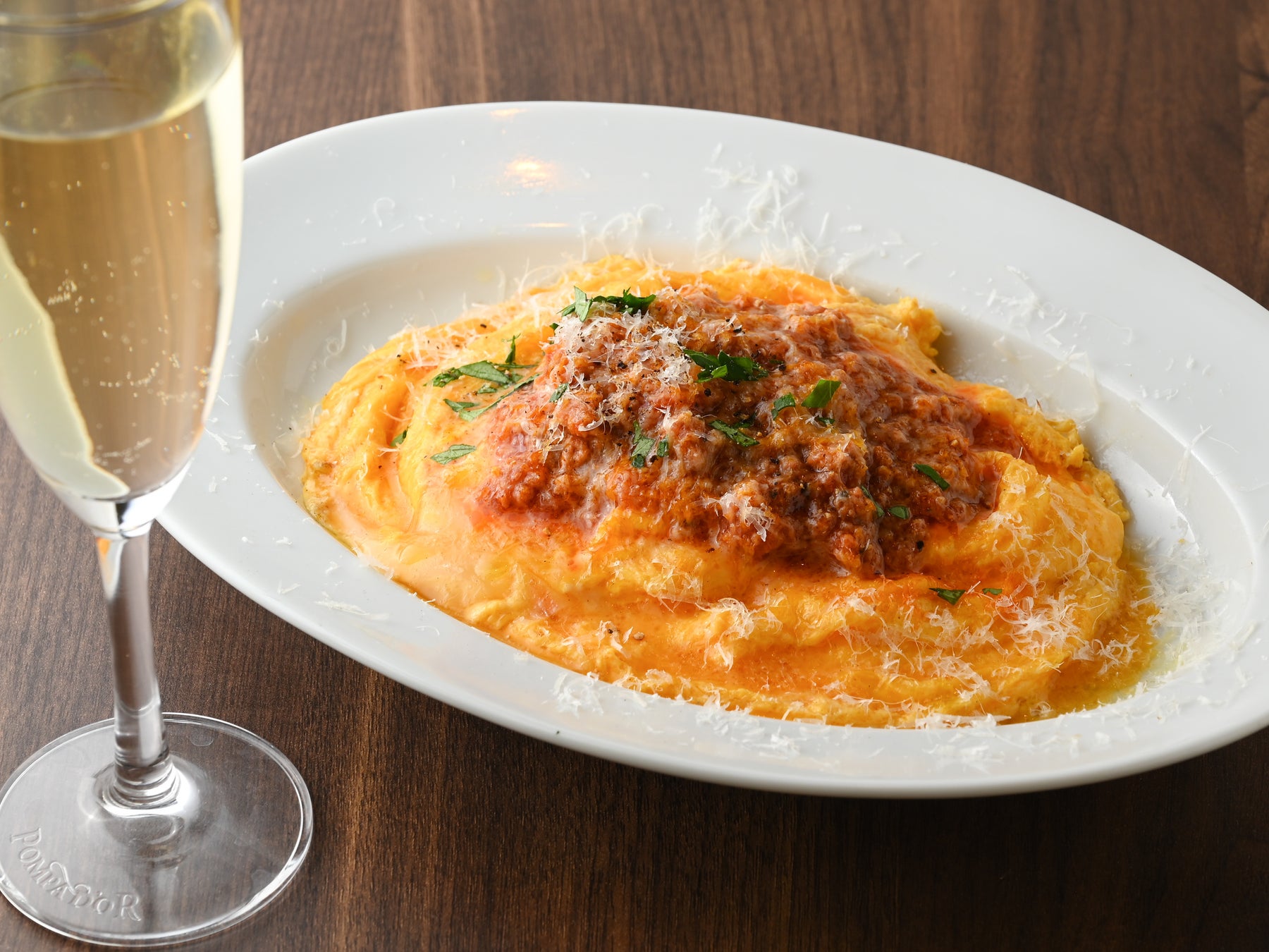 ふわとろ食感のオムレツに、じっくり煮込んだ特製ミートソースをたっぷりとかけ、仕上げに香り豊かなグラナパダーノチーズを贅沢に振りかけました。グラナパダーノチーズのコクとミートソースの旨味が絶妙に絡み合い、オムレツのやさしい味わいを引き立てます。一口ごとに広がる贅沢な風味は、ワインとのペアリングにも最適。