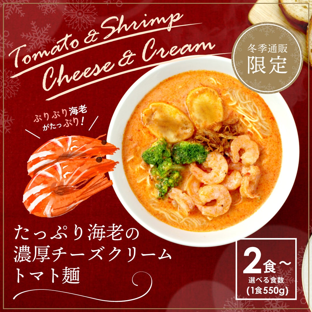 「太陽のトマト麺」は、トマトの酸味と旨味を凝縮したコク深いスープで人気のトマトラーメン専門店です。この冬、公式オンラインショップから、『たっぷり海老の濃厚チーズクリームトマト麺』が誕生しました。