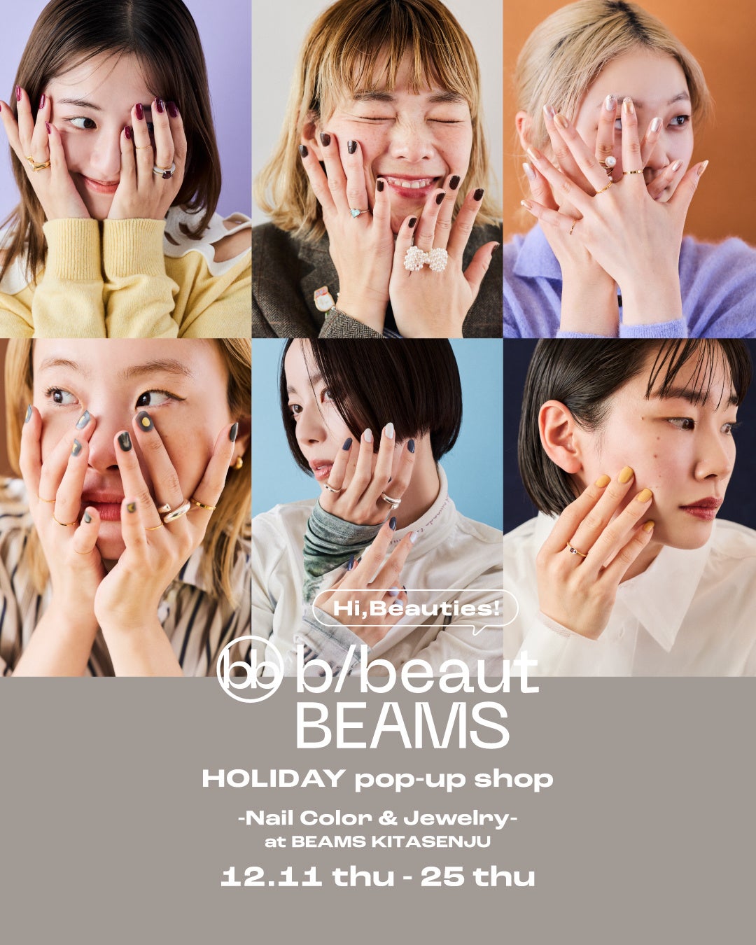 株式会社ビームス(本社所在地:東京都渋谷区、代表取締役社長:設楽洋)が展開する、ビューティ&ウェルネスにまつわる人・モノ・コトを、ビームスのスタッフが実際に体験してリポートする“ウソをつかない”ビューティ&ウェルネスブランド〈b/beaut BEAMS(ビービュート ビームス)〉は、“ホリデーシーズンに向けた手元のコーディネート”を楽しんでいただける商品をキュレーションしたポップアップショップ『Hi,Beauties! b/beaut BEAMS HOLIDAY pop-up shop ~Nail Color & Jewelry~』を、12月11日(木)〜25日(木)に「ビームス 北千住」で開催します。