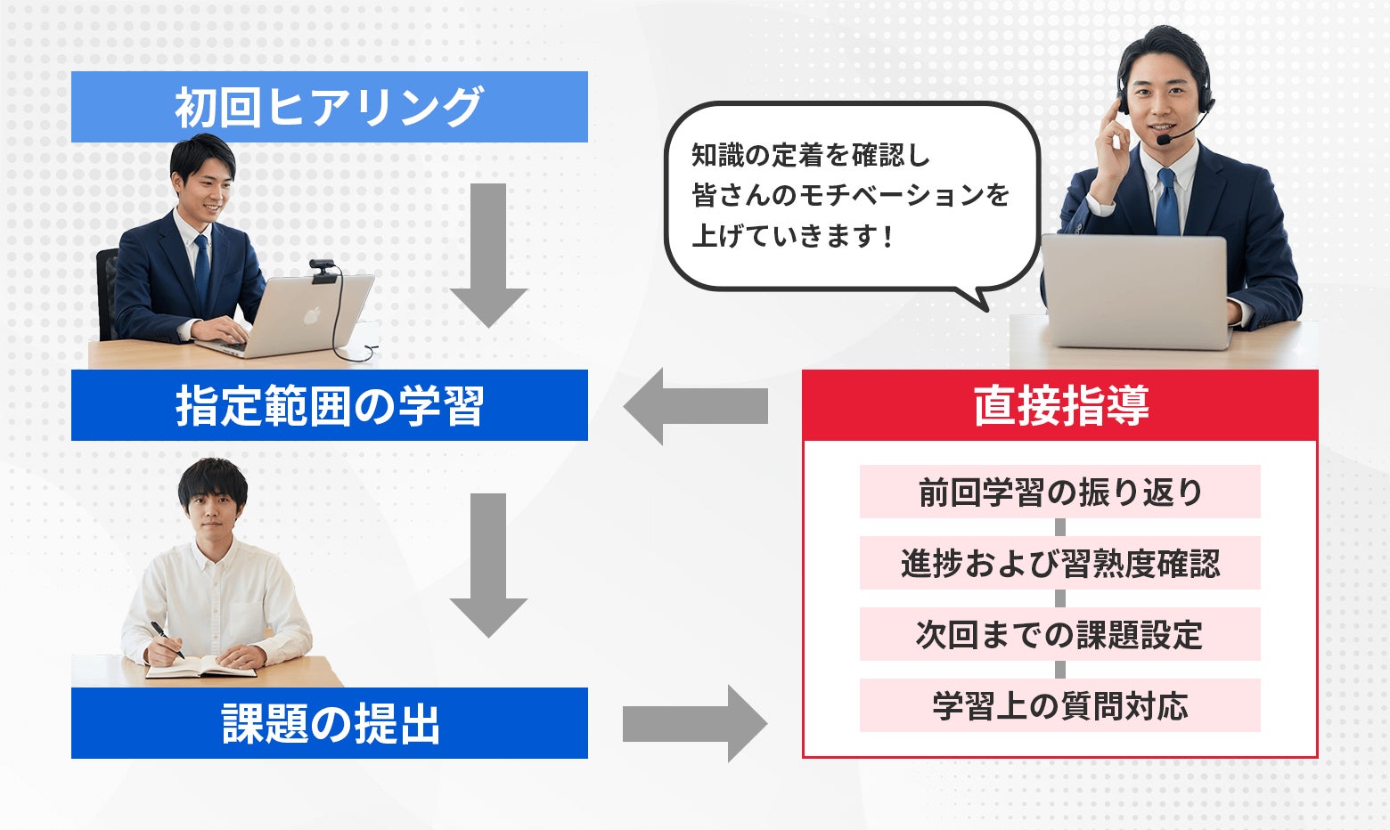 「量」の確保 毎日の学習進捗をコーチに報告する仕組みにより、モチベーションを維持。日々の継続が習慣化され、圧倒的な学習量を積み上げることができます。