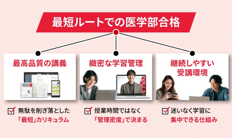 「最高品質の講義」×「緻密な学習管理」×「継続しやすい受講環境」によって、あなたの努力を確実な結果へとつなげます。