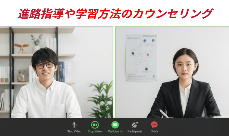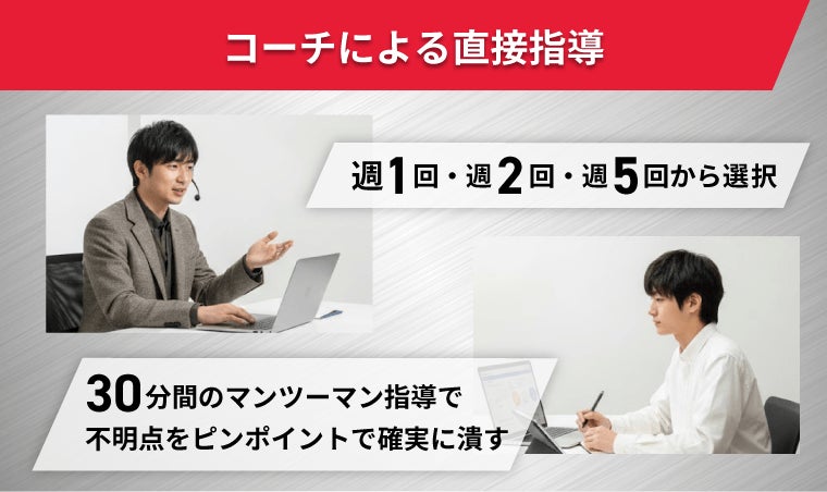 本科生コースでは、コーチによる直接指導が受けられます。個人の進捗や得意不得意に合わせて指導内容を柔軟に決定。学習進捗の確認や課題設定、モチベーション管理を行い、確実な計画遂行をサポートします。 指導回数は週1回・週2回・週5回から選択でき、30分間のマンツーマン指導で不明点をピンポイントで確実に潰していきます。