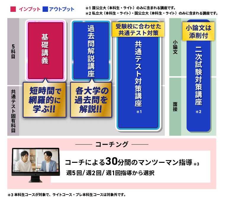 また、面接、小論文対策(添削付き)に加え、国公立大を目指す方、および私立大の共通テスト利用入試をご検討の方には、共通テスト対策もご用意しておりますので、合格に必要な全ての準備をすることができます。