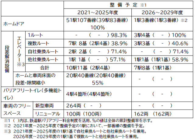 なお、2029年度までに、ホームドア136駅273番線、エスカレーター70駅161基の設備更新を予定しています。