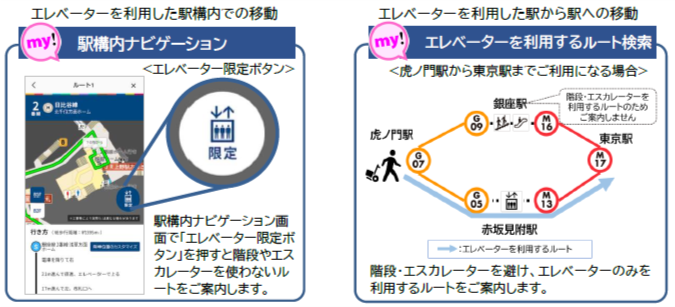 2021年3月から東京都交通局と連携し、両社局の公式アプリ(東京メトロmy!アプリ及び都営交通アプリ)において、ホームから地上出口までといった、駅構内のお客様の移動ルートを平面図や説明文でご案内する「駅構内ナビゲーション」機能を提供しています。