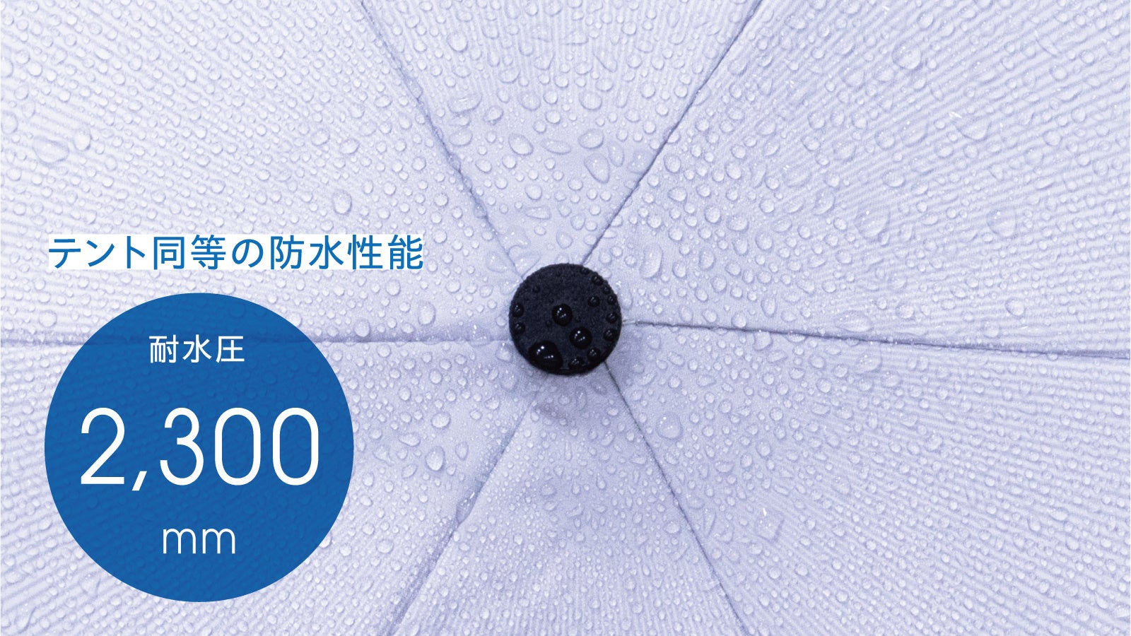 耐水圧はテントに匹敵する2,300mmと、一般的な傘の約4〜6倍!撥水加工と耐水圧のコンビネーションで雨傘としても活躍。