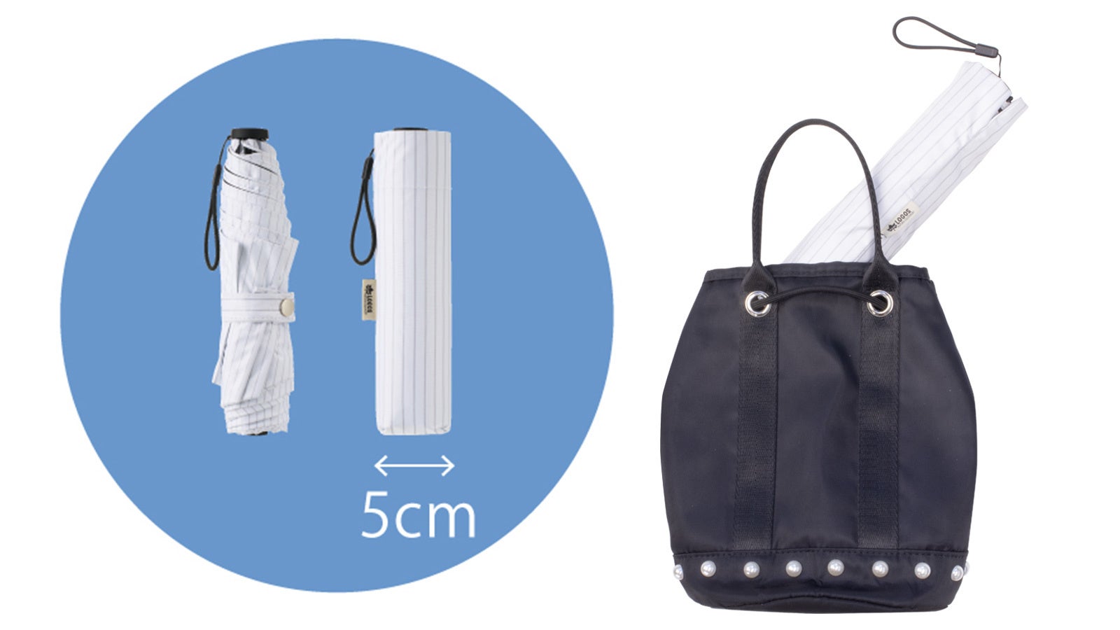 収納サイズの直径はたったの5cmと、バッグにも入りやすいスリム設計。通勤や通学のほか、荷物が増えやすい旅行や出張時にも最適。