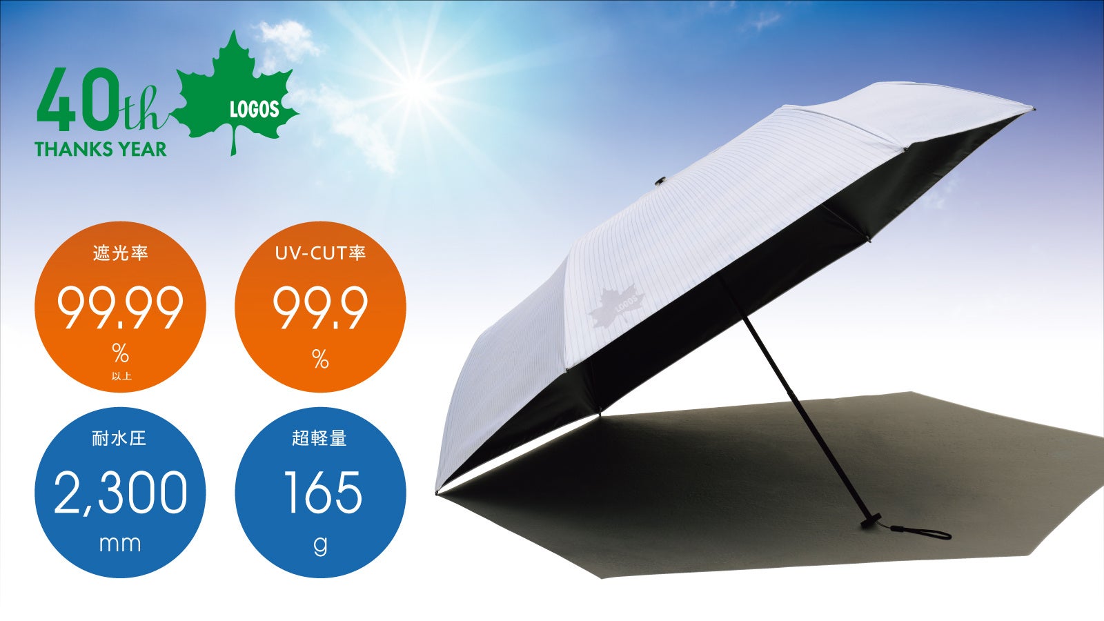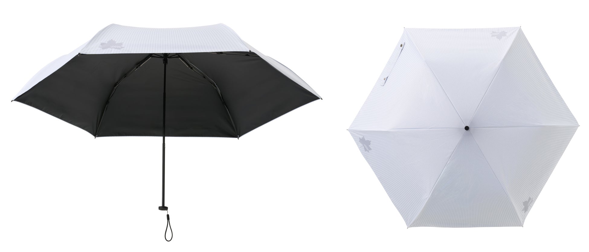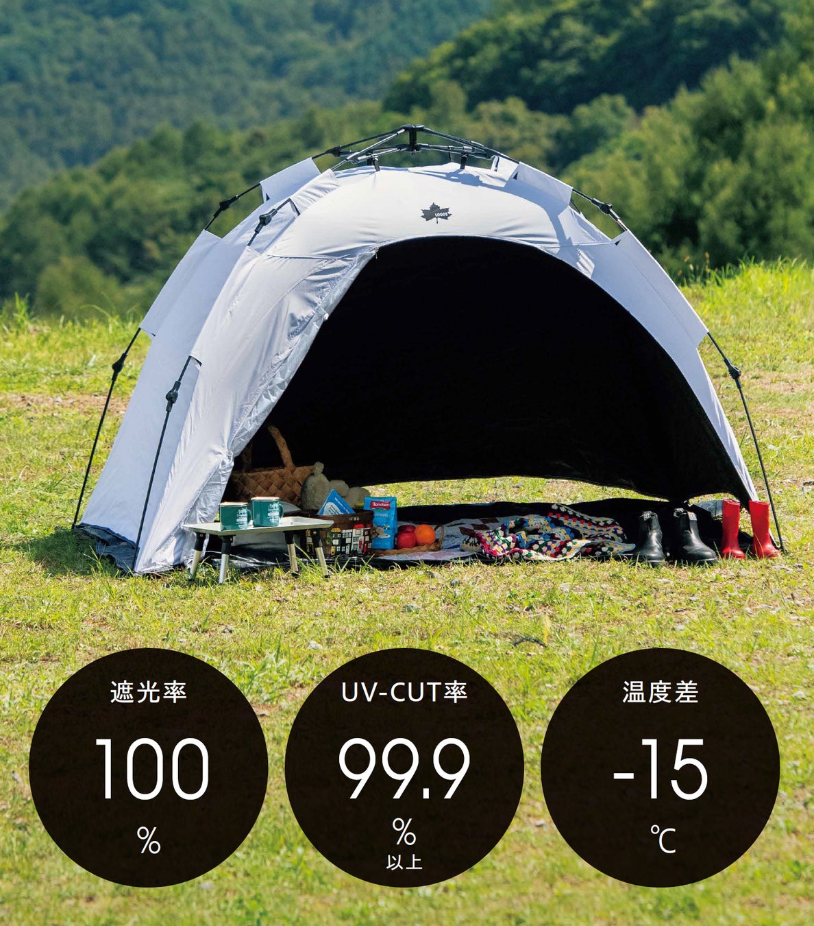 テントやタープにて大好評をいただいているロゴス独自技術のソーラーブロック加工は、「遮光率100%」「UV-CUT率99.9%以上」「日向との温度差-15℃の日陰を生み出す」特殊コーティングです。その技術を日傘にも応用しました。