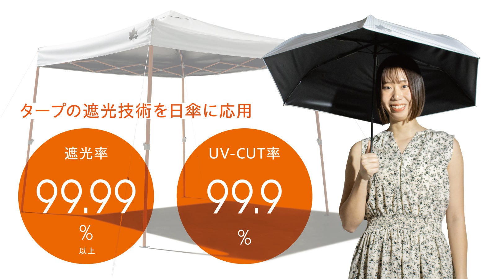 本アイテムは、驚異の「遮光率99.99%以上」「UV-CUT率は99.9%以上」を実現した折りたたみ日傘です。