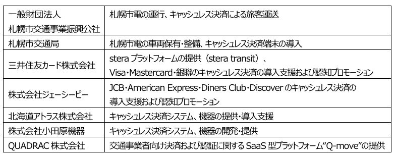 一般財団法人札幌市交通事業振興公社(北海道札幌市、理事長:中田 雅幸、以下:札幌市交通事業振興公社)、札幌市交通局(北海道札幌市 交通事業管理者:梅田 岳)、三井住友カード株式会社(本社:東京都江東区、代表取締役 社長執行役員 CEO:大西 幸彦、以下:三井住友カード)、株式会社ジェーシービー(本社:東京都港区、代表取締役会長兼執行役員社長:二重 孝好)、北海道アトラス株式会社(本社:北海道札幌市、代表取締役社長:川西 哲也)、株式会社小田原機器(本社:神奈川県小田原市、代表取締役:津川 直樹)、QUADRAC株式会社(本社:東京都中央区、代表取締役社長:高田 昌幸)は、2026年4月27日(月)、札幌市交通事業振興公社が運行する札幌市電において、三井住友カードが提供する公共交通機関向けソリューション「stera(ステラ) transit(トランジット)」を活用した「クレカ乗車」サービス※、および、土日祝・年末年始(12/29~1/3)を対象とした上限運賃サービス「札幌市電クレカ乗車ホリデー割」を開始することについて、以下の通りお知らせします。