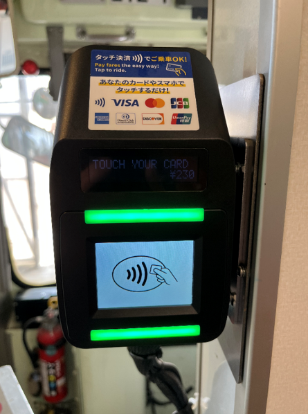 お手持ちのタッチ決済対応のカード(クレジット・デビット・プリペイド)や、カードが設定されたスマートフォン等を、降車時に専用の端末にタッチすることで、そのままご利用いただけます。