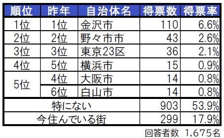 住みたい街は5年連続で1位金沢市、2位野々市市。3位は2年連続で東京23区。