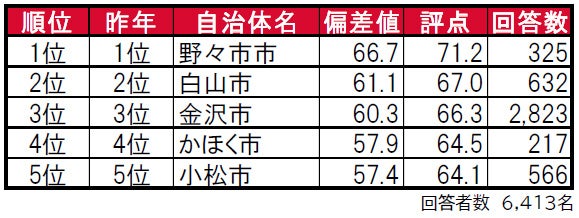 住みここち1位は5年連続で野々市市。2位と3位は2年連続で白山市と金沢市。