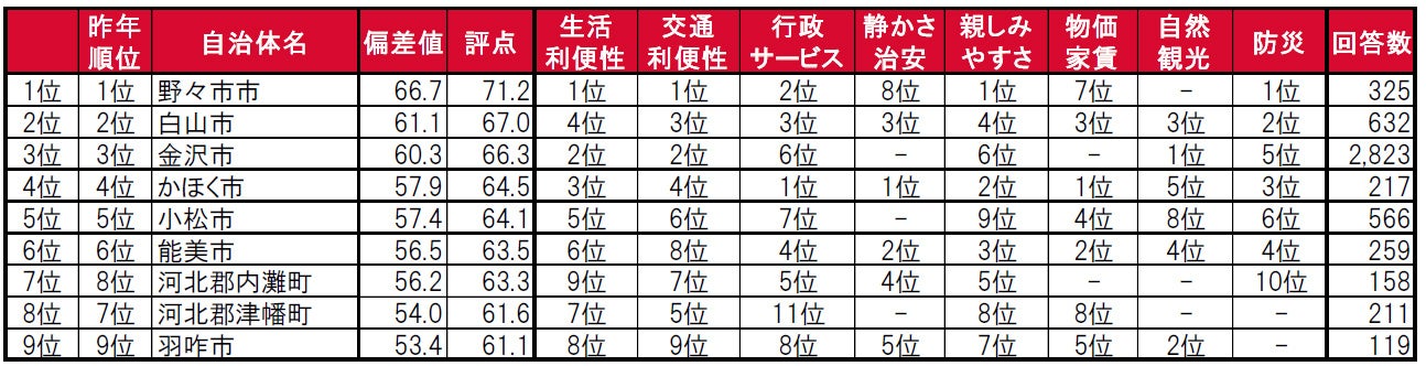 街の住みここちランキング2023<石川県版>自治体TOP9 因子別順位