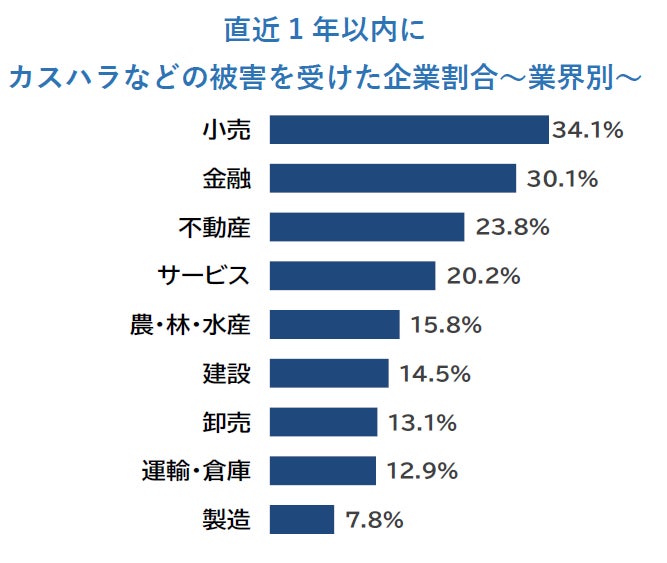 また、直近1年以内にカスハラなどを受けたことが「ある」企業を業界別でみると、『小売』(34.1%)がトップとなり、『金融』(30.1%)、『不動産』(23.8%)、『サービス』(20.2%)と主に個人を取り引きの対象とする業界が比較的高い割合で並んだ。また、主に企業間での取り引きが多い