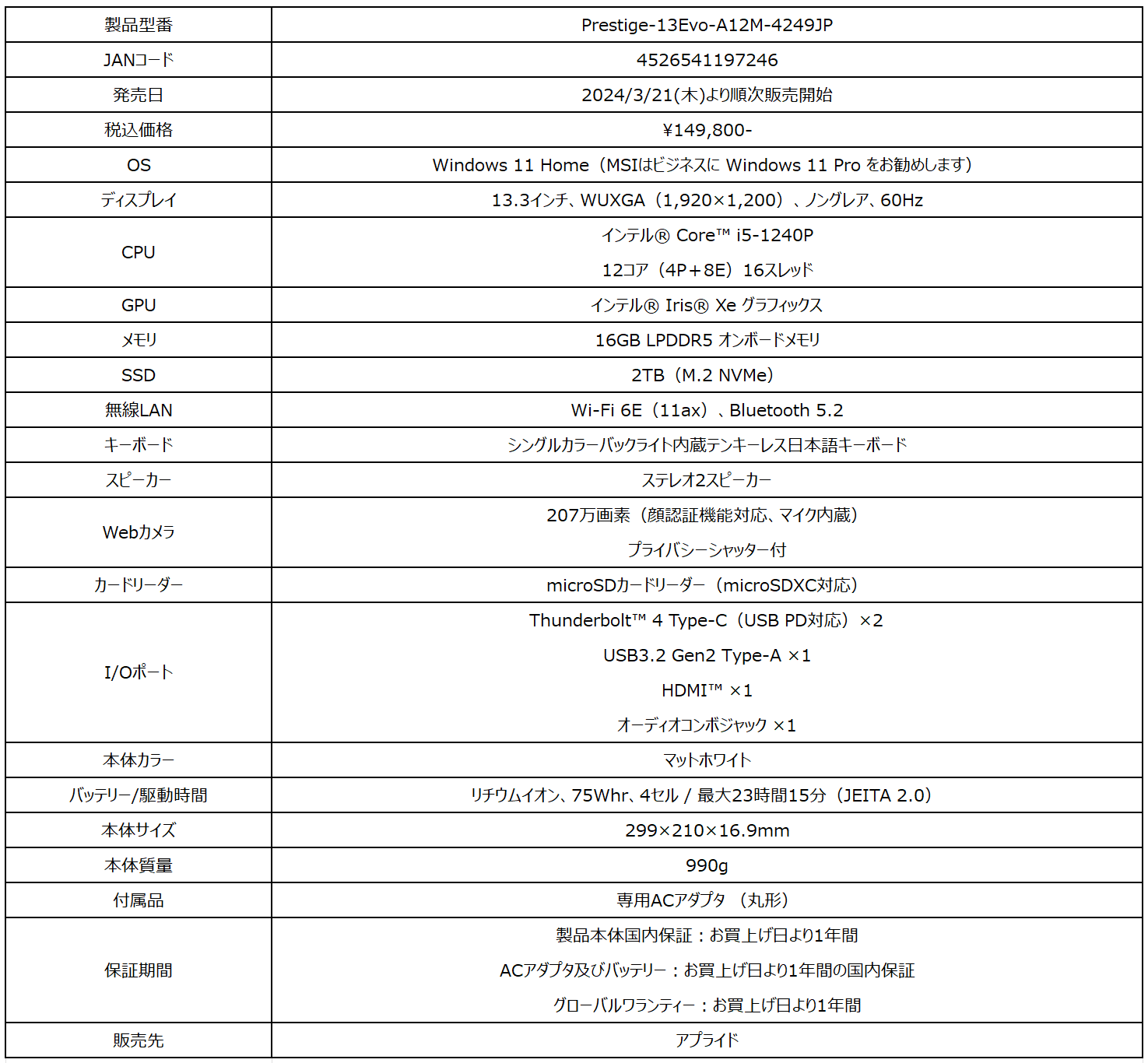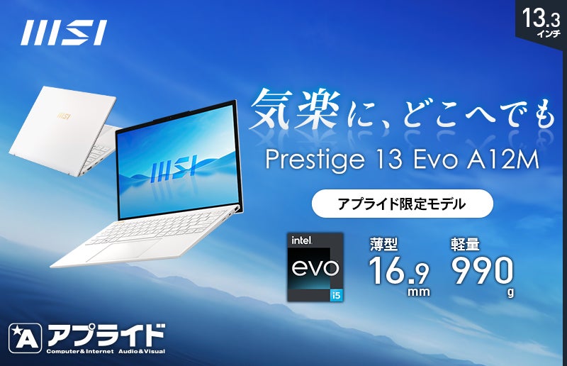 軽さ990gの本体にCore™ i5搭載でパワフル・高速・快適動作! 13.3インチ薄型・軽量ビジネスノートPC アプライド限定モデル「Prestige-13Evo-A12M-4249JP」発売