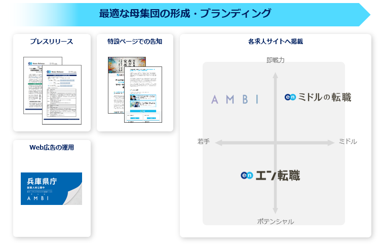 プレスリリースや特設ページ、Web広告での告知に加え、各求人サイトでの集客支援を実施。『エン転職』『AMBI』『ミドルの転職』とターゲットの異なる求人サイトを活用することで、ターゲットへ網羅的に求人を届けました。