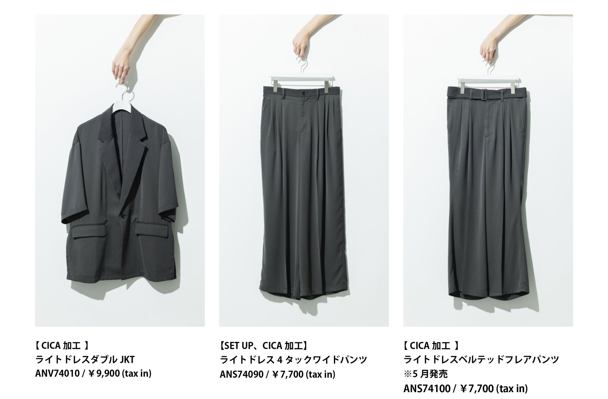 肌の乾燥などのトラブルを和らげる効果がある天然保湿成分のツボクサエキスを配合した CICA 加工の開発素材を使用し ています。アイテムはジャケット、ワイドパンツ、フレ アパンツの 3 型展開。トロミのある滑らかな素材で肌あたりも 心地良く、快適に着用いただけます。