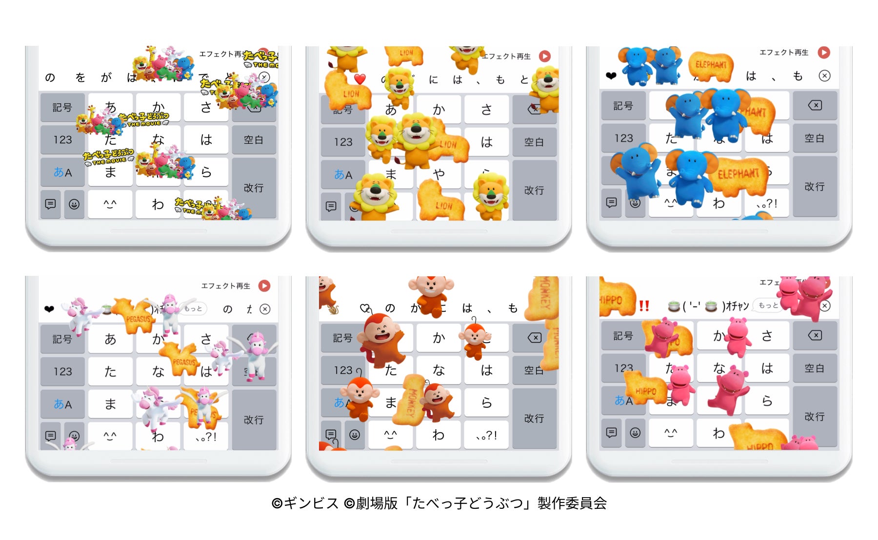 ユーザーが文字を入力し、変換候補から特定のキーワードを選択することで画像や動画がキーボード上で再生される機能です。本コラボでは、「たべっ子どうぶつ」「らいおんくん」「ぞうくん」「ぺがさすちゃん」などのキーワード(※)を入力することで特別な演出をお楽しみいただけます。