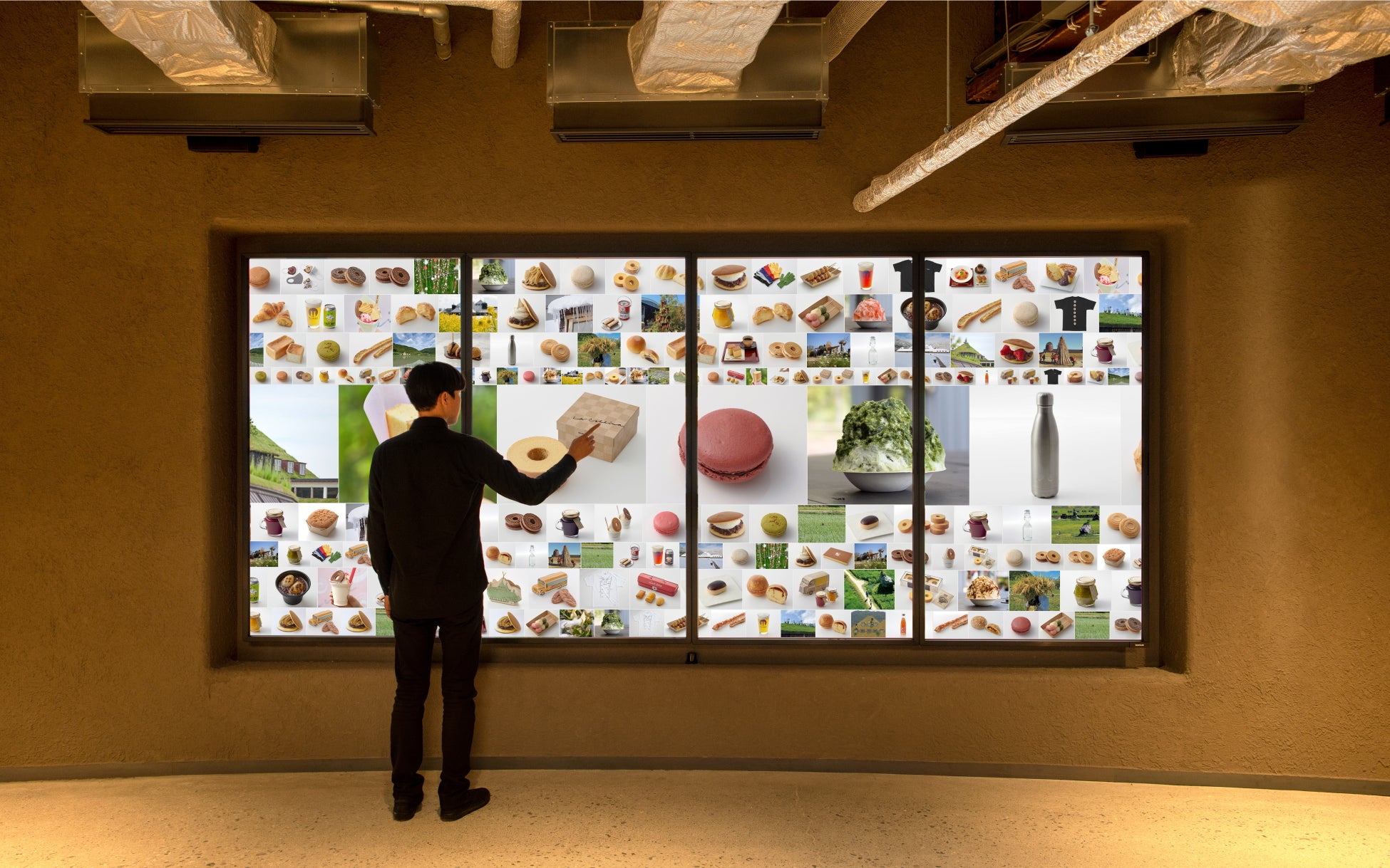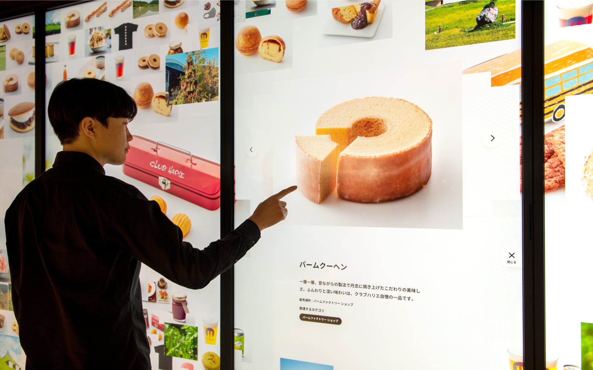 「バームファクトリー」の大型タッチパネルサイネージには、クラブハリエの商品や、移ろいゆく四季とともに美しい景色を見せてくれるラ コリーナ近江八幡の写真が広がっています。気になる画像や動画にタッチすると拡大され、お菓子などの詳細情報をインタラクティブに見ることができます。