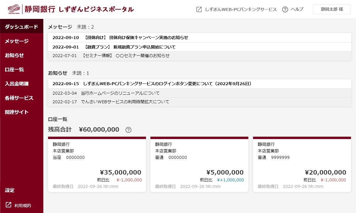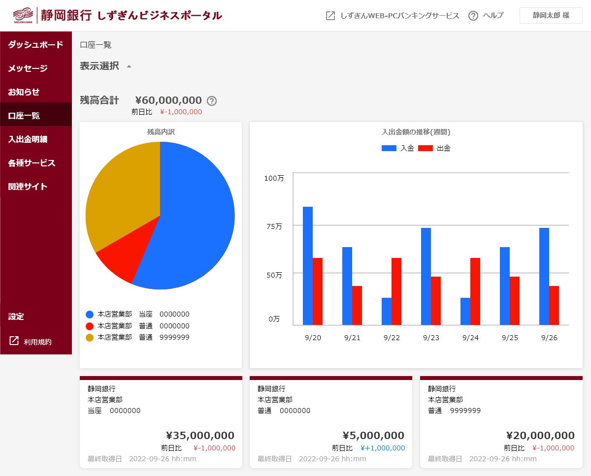 法人・個人事業主のお客さまが、入出金や残高情報などの取引明細照会だけでなく、静岡銀行が提供する金融商品の情報や各種サービスに簡単にアクセスすることができる無料のサービスです。