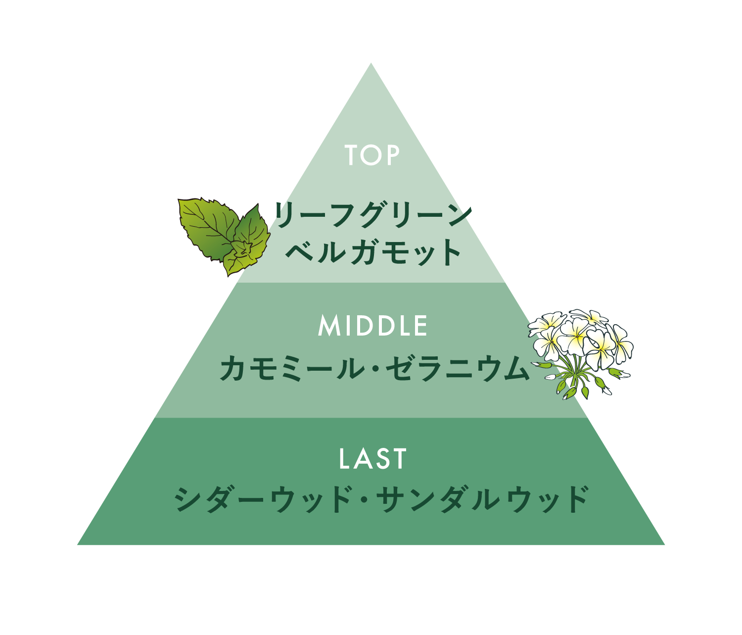 ・デューイー: 洗練されたハーバルなリーフグリーンとゼラニウムの香り