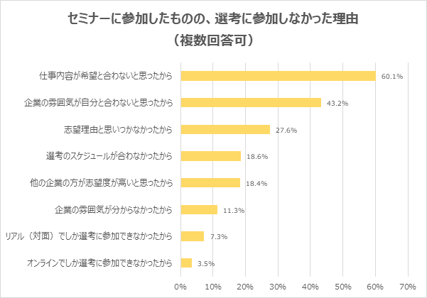 「セミナーに参加したものの、選考に参加しなかった企業がある」と回答した学生が7割を超える。理由は「仕事内容が希望に合わない」が最多。次いで、「企業の雰囲気が自分とは合わない」