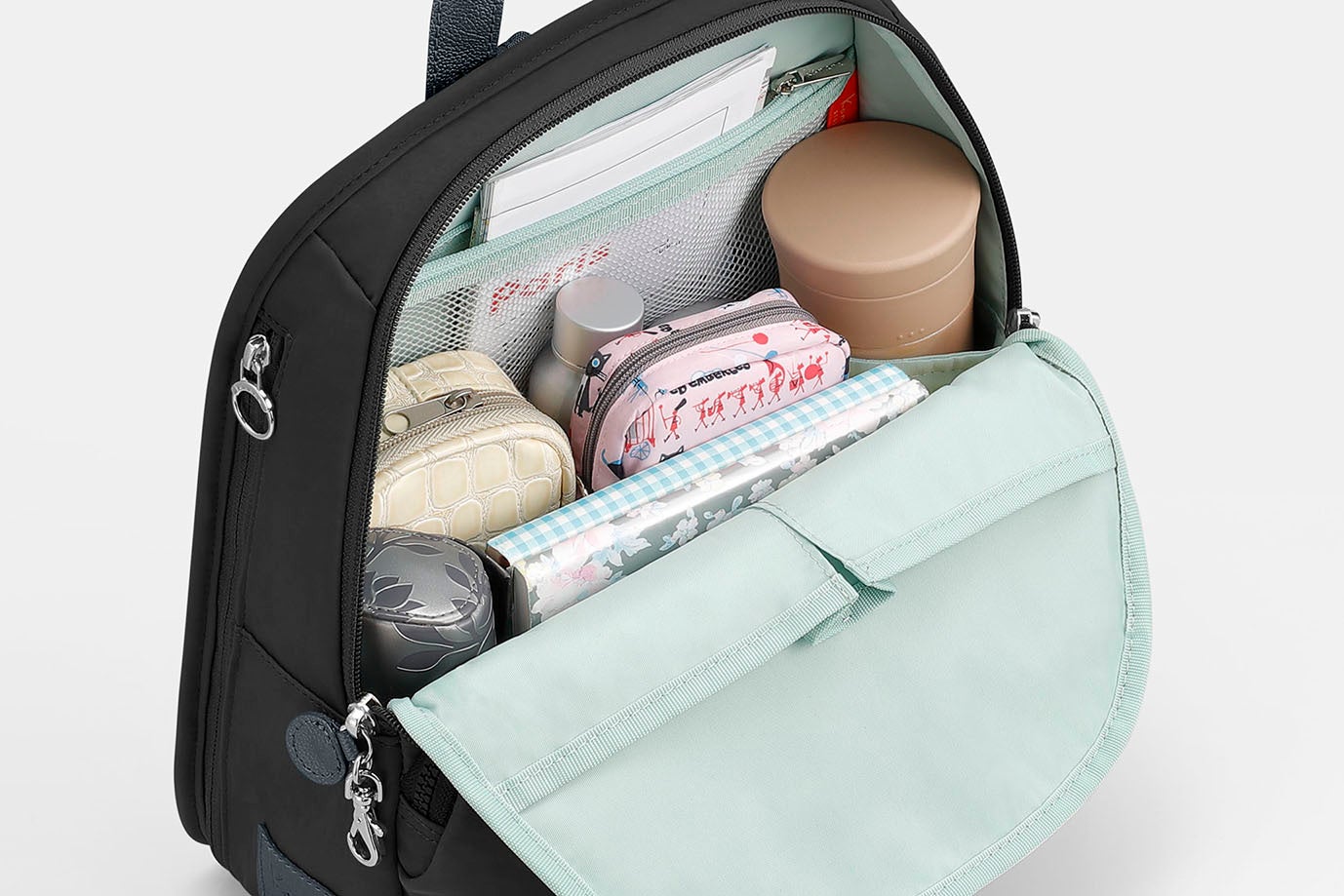 中身が見えるメッシュポケットや、折り畳み傘も収納できるボトルホルダーなど、多彩なポケットを配置しました。