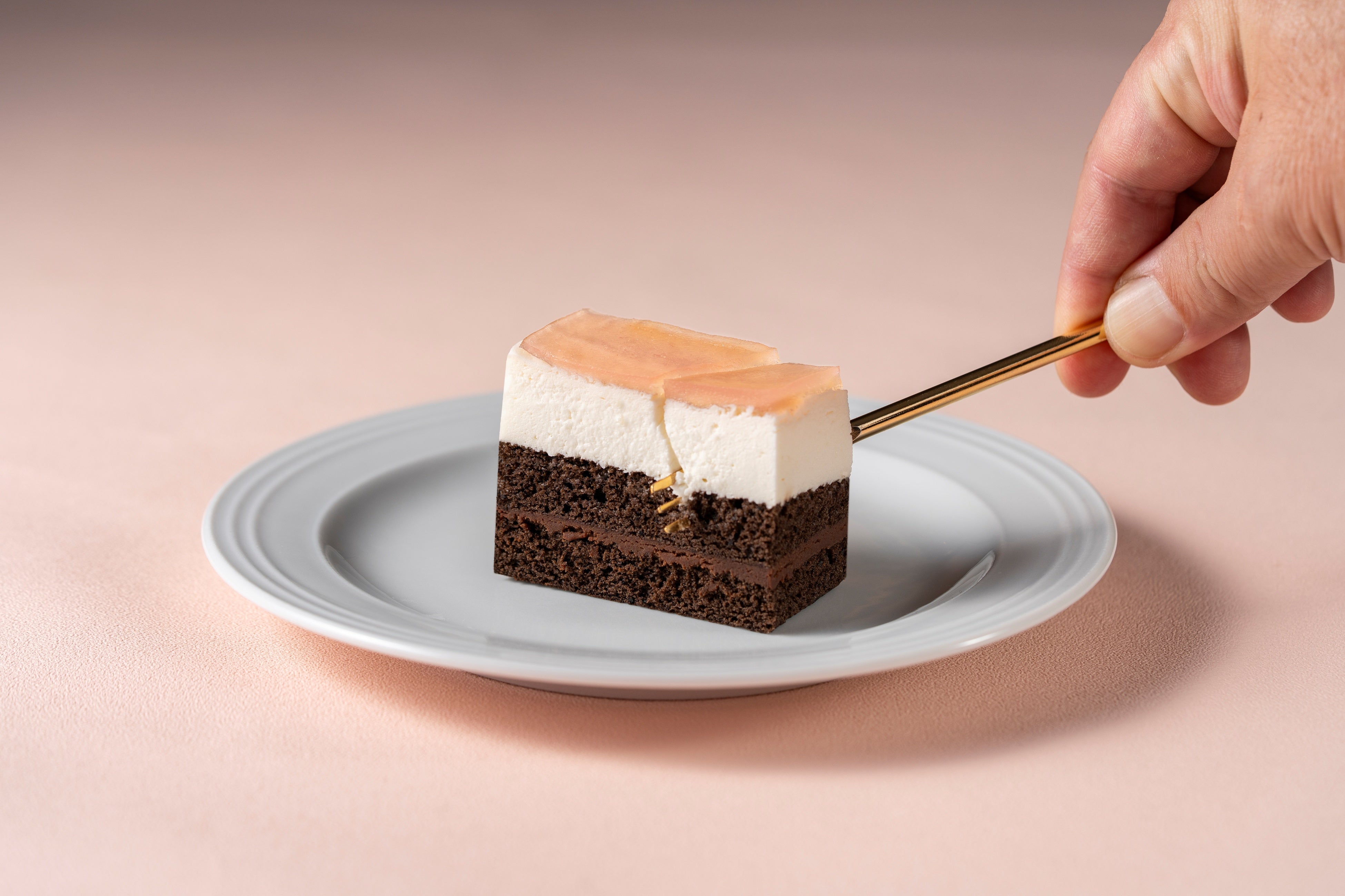 柑橘の爽やかな香りがチョコレートの優しい甘さと重なり合い、口の中でふわりと華やかな余韻を残します。サシェ風スポンジには、香りづけにブランデーを効かせたシロップを打ち、香り高くしっとりとした食感に仕上げました。オレンジピールをアクセントにしたクリームと重ねることで、チョコレートの甘みとコク、そして柑橘の爽やかさが重なり合う、奥行きのある味わいをお楽しみいただけます。
